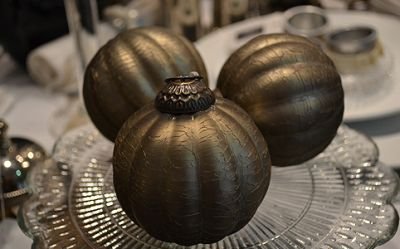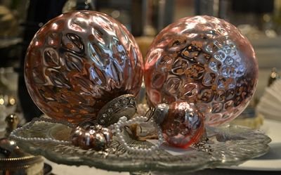 Régies hatású gömb, amely mintha a boldog békeidőkből maradt volna itt. A sötét gömbök legjobban a fehér műfenyőn mutatnak, de a terített asztal dekorációi is lehetnek.