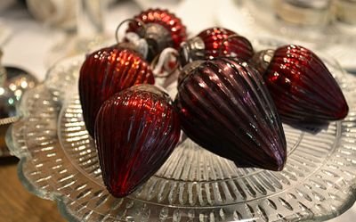 Piros és lila üvegcseppek. Formájuk a régi karácsonyfaégők izzóira emlékeztet, és persze ezzel az emlékkel érkezik a gyerekkori karácsonyok gyönyörűsége is.