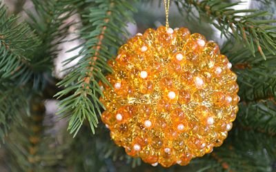 Gazdagon díszített gömb, indiai színkavalkádra emlékeztető vibrálással. Olyan helyre kerülnek majd a fán, ahol minden oldalról jól látszik, azaz valahova a csúcsdísz környékére.