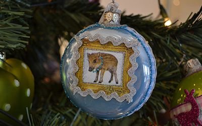 A rejtély nem az, hogy miért lapos a karácsonyi gömb, és nem is az, hogy egy vaddisznó van rajta, hanem az a nagy kérdés, mint keres egy gyöngysor a malac nyakában.